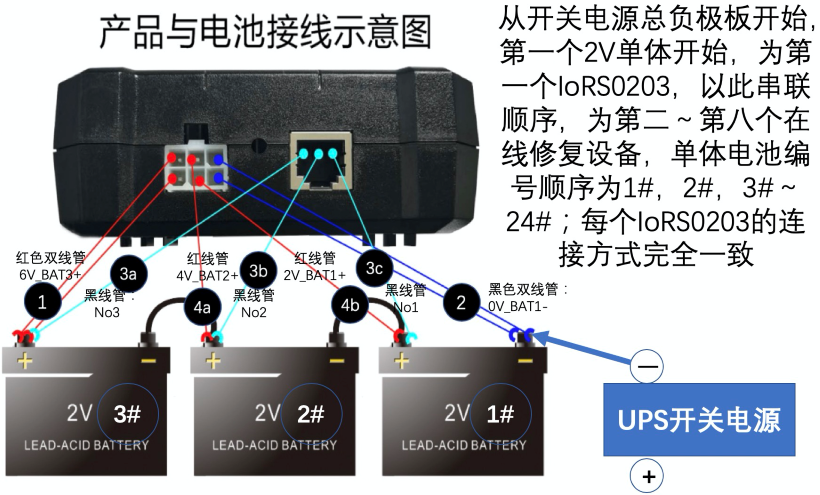 把IoRS0203的電池輸入/輸出接口電纜的黑色輸出線連接到電池的負極,紅色輸出線連接到對應電池的正極柱,注意請按線標號正確連接(如上圖標示)。